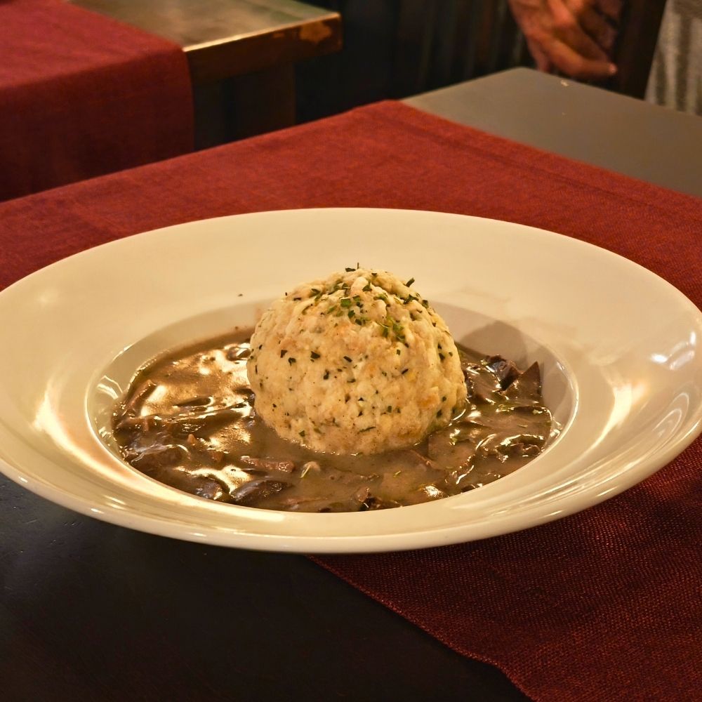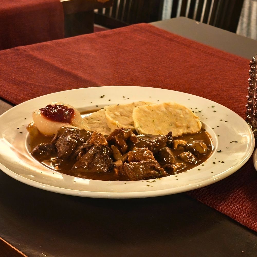 Hirschragout mit Waldpilzen und Serviettenknödel € 21,90