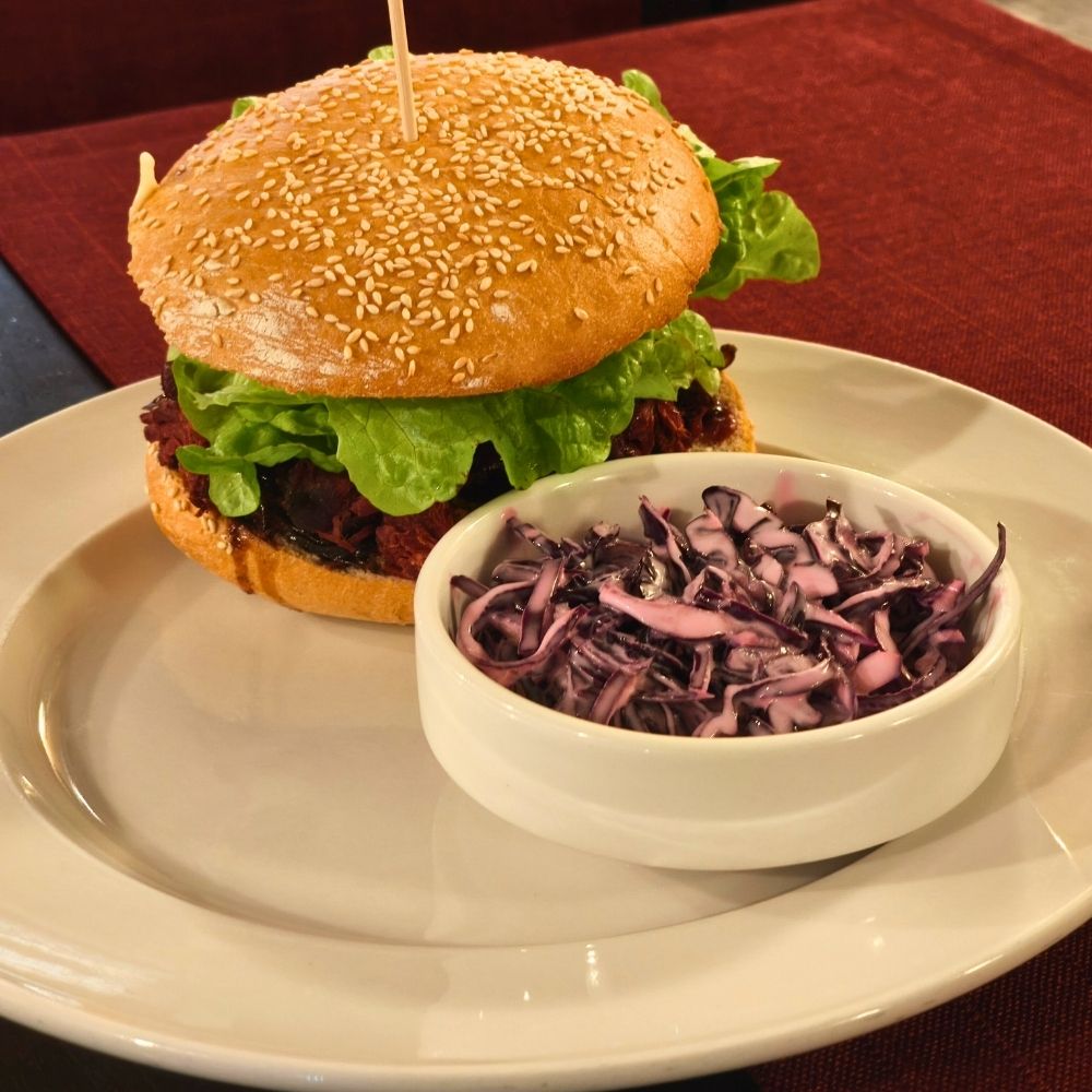 Hirschburger mit Rotkraut € 23,90